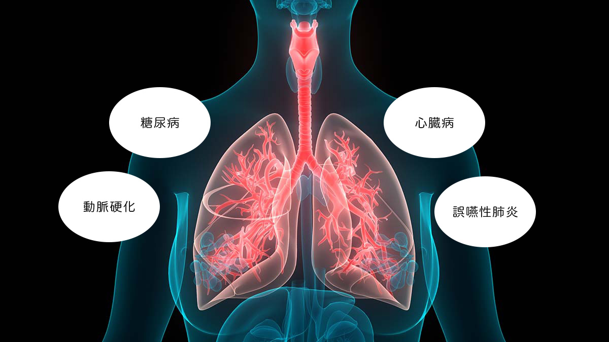 糖尿病、動脈硬化、誤嚥性肺炎、心臓病、早産や低体重児出産、など。挙げていけばキリがないほど歯周病は様々な病気に関わっています。歯周病菌は口腔内や血管から全身に拡がり、病気を誘発します。